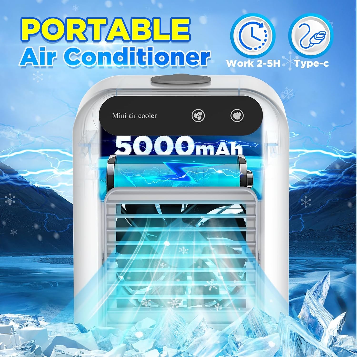 Rechargeable portable air conditioner with a 5000 mAh battery that can last up to 4 hours, you can easily power it using a laptop, power bank, power strip, etc. The personal air cooling fan with a large 500ML sealed water tank, offering up to 8 hours of continuous operation.